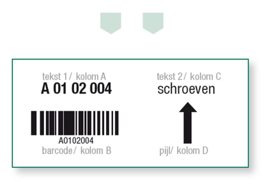 | 1 | tekst 1 | barcode | tekst 2 | pijl |