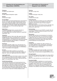 Inkjet-print: Bij oplosmiddelhoudende inkten alleen COROPOL magneetfolie met witte toplaag gebruiken. Bij inkten op waterbasis s.v.p. COROPRINT magneetfolie gebruiken.