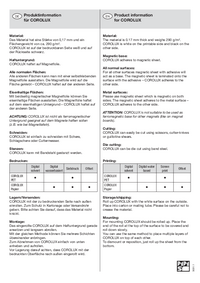 Materiaal: Het materiaal heeft een dikte van 0,17 mm en weegt ca. 290 g /m². COROLUX is aan de bedrukbare zijde wit en aan de achterzijde zwart.
